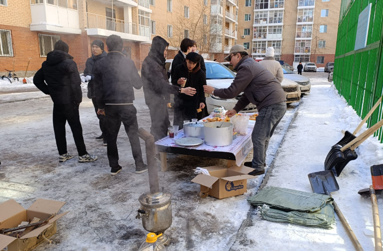 На придомовой территории развернулся настоящий полевой стан: пока одни жители занимались очисткой территории, другие готовили традиционные угощения. На кострах томился плов и наурыз-коже, а столы ломились от свежих баурсаков.