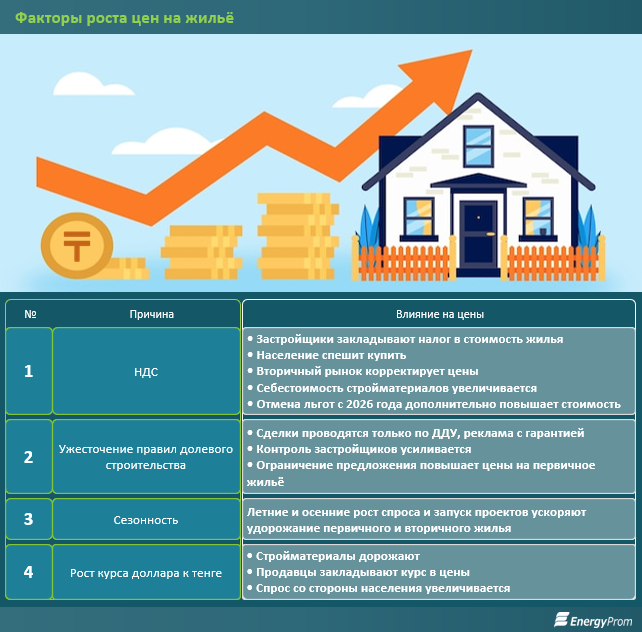 Традиционно рынок жилья в Казахстане демонстрирует выраженные сезонные колебания. Летом и ранней осенью активность покупателей возрастает: люди стремятся завершить сделки до конца года, а застройщики запускают новые проекты. В 2025-м этот эффект усилился на фоне ожидания повышения НДС и ужесточения правил долевого строительства. Рост спроса в пиковые месяцы создал дополнительное давление на цены, ускоряя их повышение как на первичном, так и на вторичном рынке.