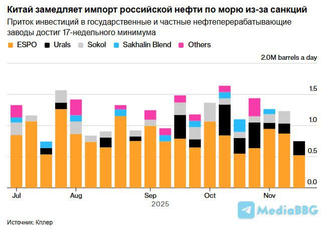 "По оценкам аналитиков компании Rystad, морской импорт российской нефти в Китай может сократиться на 500–800 тыс. баррелей в сутки, а поставки из Ирана — на 200–400 тыс. баррелей в сутки. Основной причиной сокращения потоков стали ключевые маршруты, оказавшиеся под воздействием новых ограничений", - пишет информагентство.