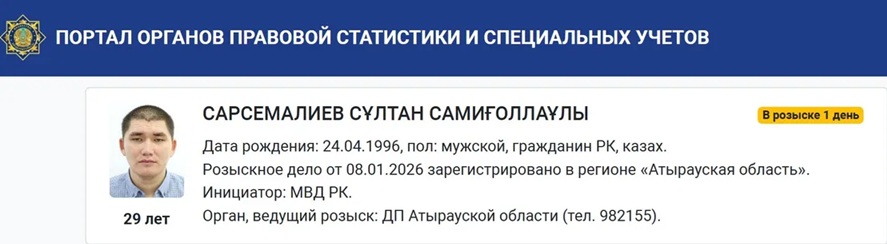 В деле говорится, что разыскивается гражданин РК Султан Сарсемалиев 1996 года рождения.