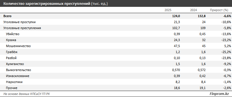 "Наиболее существенно сократилось число краж (на 23,2%), грабежей (на 25,2%) и разбоев (на 23,8%), что может свидетельствовать об эффективности мер по защите имущества и усилении работы правоохранительных органов в сфере пресечения насильственных имущественных преступлений. Также наблюдалось уменьшение количества убийств (на 13,6%) и случаев хулиганства (на 9,2%)", - пишет Finprom.kz.