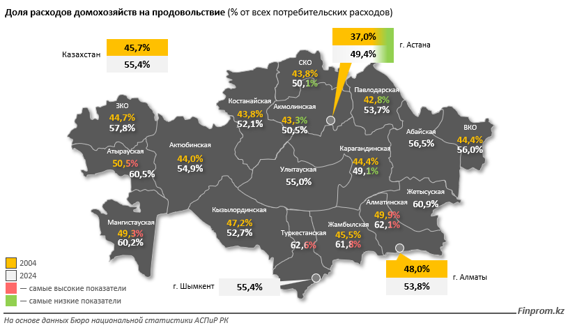 По данным Finprom.kz, в 2004 году ситуация была следующей: значительно меньше на продукты тогда также тратили жители столицы, ближайшей Акмолинской и Павлодарской областей. Наибольшие показатели удельного веса продовольственных расходов наблюдались на западе — в Атырауской и Мангистауской областях, — а также в Алматинской области.
