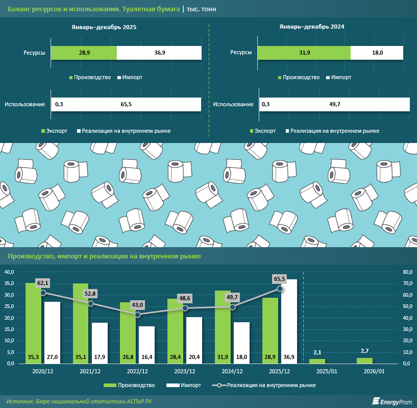 По данным бюро национальной статистики АСПиР РК, в 2025 году реализация туалетной бумаги в Казахстане выросла на 31,9%, составив 65,5 тыс. тонн. Однако отечественные производители за тот же период произвели только 28,9 тыс. тонн - на 9,4% меньше, чем в 2024 году. Это привело к резкому увеличению импортных поставок, которые удвоились на фоне растущего рынка санитарной продукции. Импорт стал закрывать дефицит, и доля зарубежной туалетной бумаги в потреблении страны достигла 51,9%.