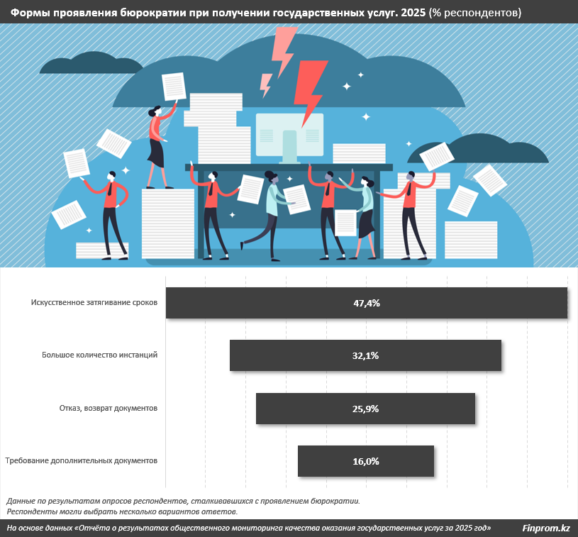 Искусственное затягивание сроков оказания госуслуг остаётся самой распространённой проблемой, с которой сталкиваются граждане. Об этом свидетельствуют результаты социологического исследования, передает inbusiness.kz со ссылкой finprom.kz.