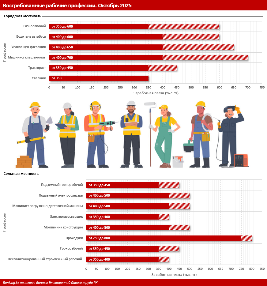 Так, наиболее востребованные рабочие профессии в городской местности — разнорабочий (предлагаемые зарплаты — 350–600 тыс. тенге), водитель автобуса (400–600 тыс. тенге), упаковщик-фасовщик (400–650 тыс. тенге), машинист спецтехники (400–700 тыс. тенге), тракторист (350–450 тыс. тенге) и сварщик (от 350 тыс. тенге).