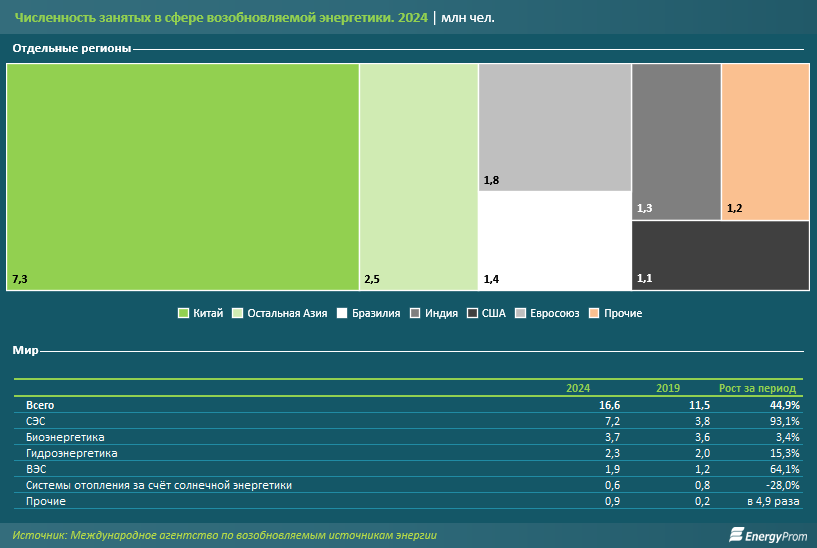 Международное агентство по возобновляемым источникам энергии (IRENA) в январе 2026 года опубликовало доклад о влиянии "зелёной" энергетики на мировую занятость. Согласно документу, к концу 2024 года в секторе ВИЭ работало 16,6 млн человек, что на 44,9% превышает показатель 2019 года. Наиболее активный рост численности сотрудников наблюдался в солнечной энергетике: число занятых на СЭС увеличилось с 3,8 млн до 7,2 млн.