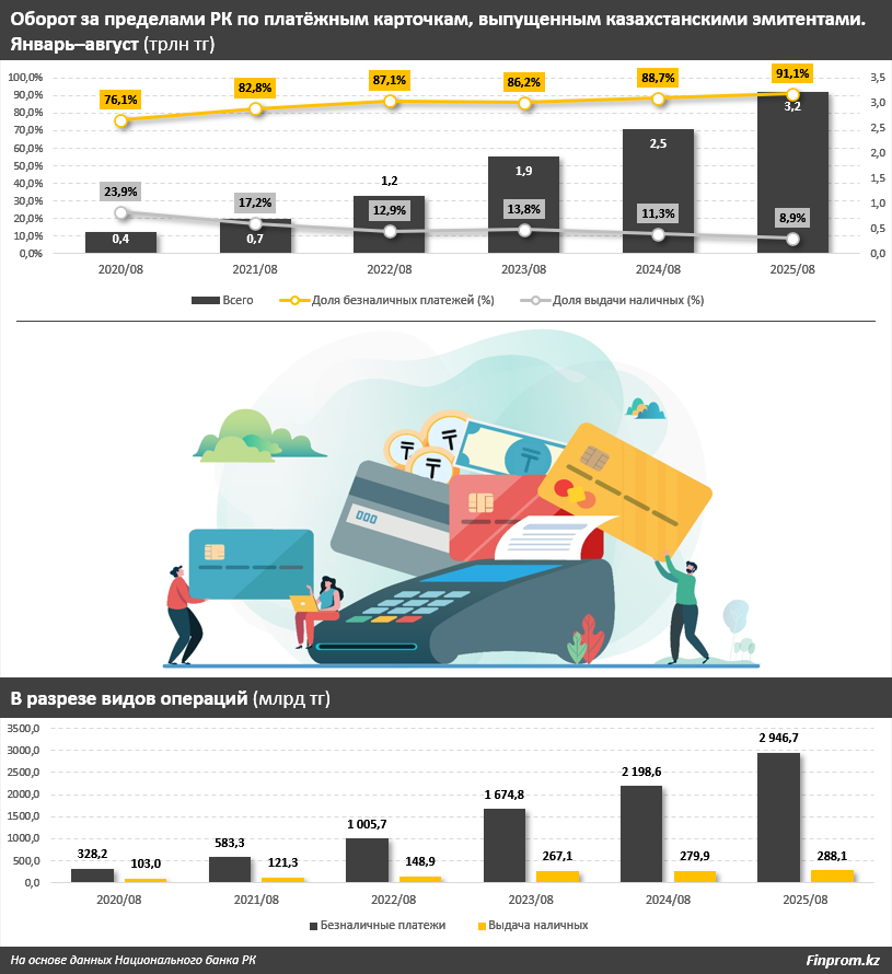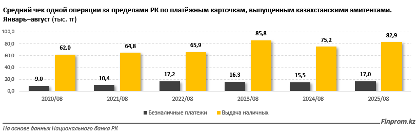 За январь-август 2025 года средний чек одной операции с использованием казахстанских платёжных карточек за рубежом вырос как по безналичным платежам, так и по выдаче наличных. Так, средний чек одной безналичной операции за год увеличился с 15,5 тысячи до 17 тысячи тенге, а по выдаче наличных - с 75,2 тысячи до 82,9 тысячи тенге.
