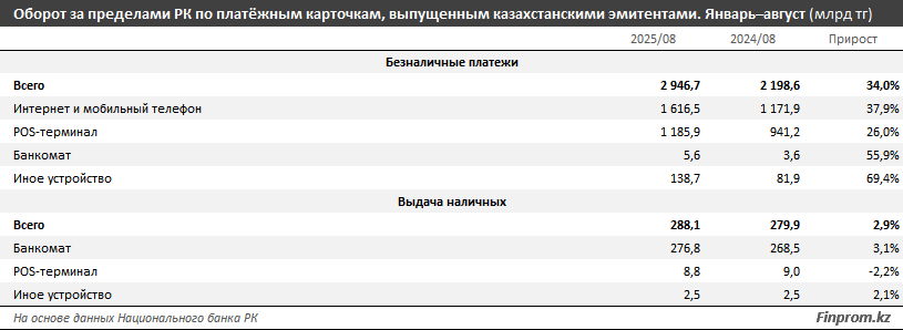 В разрезе среды проведения операции более половины объёма безналичных платежей за пределами РК с использованием казахстанских карт за январь-август 2025-го пришлось на интернет и мобильный телефон: 1,6 триллиона тенге, рост за год - на 37,9%. Безналичные платежи через POS-терминалы составили почти 1,2 триллиона тенге - на 26% больше, чем за январь-август 2024 года. На безналичные платежи с использованием банкоматов пришлось лишь 5,6 миллиарда тенге - более чем в полтора раза больше, впрочем, чем годом ранее. Безналичные платежи через иные устройства суммарно составили 138,7 миллиарда тенге.