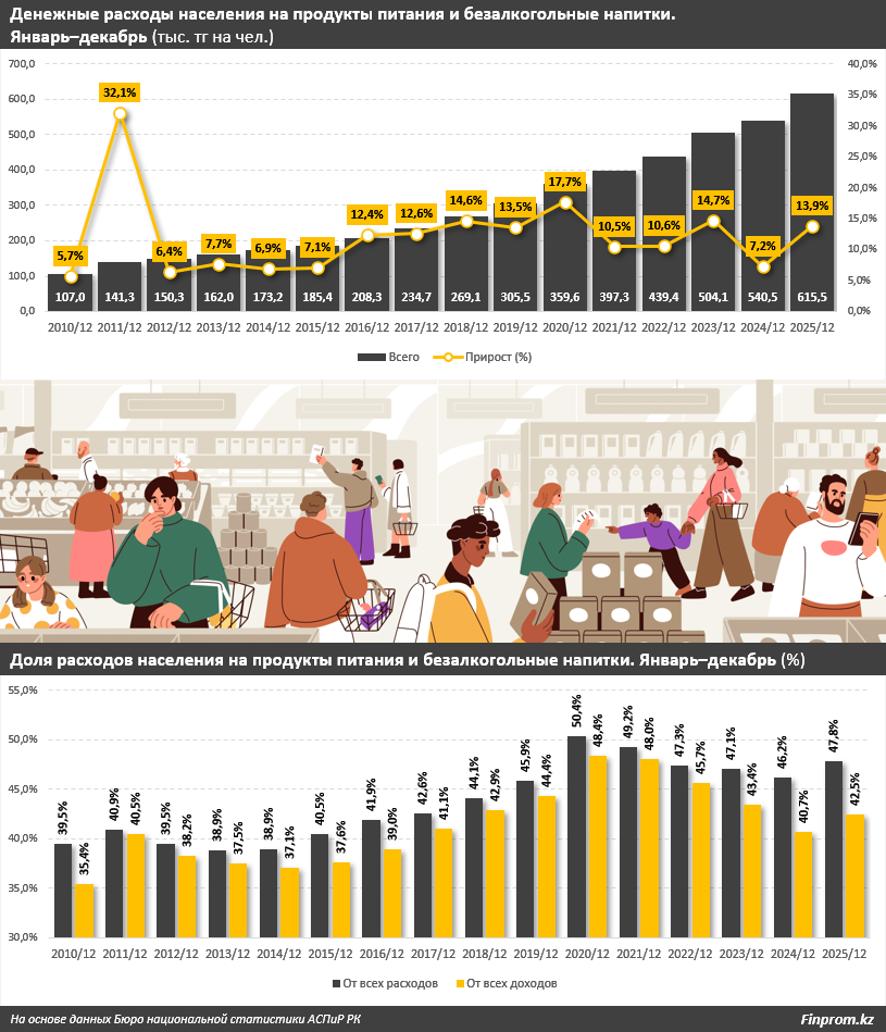 По итогам 2025 года денежные расходы на продукты питания и безалкогольные напитки достигли 615,5 тыс. тг в среднем на человека. В сравнении с предыдущим годом сумма выросла на 13,9%, а в долгосрочной ретроспективе, с 2010-го, номинальные траты увеличились почти в 6 раз.