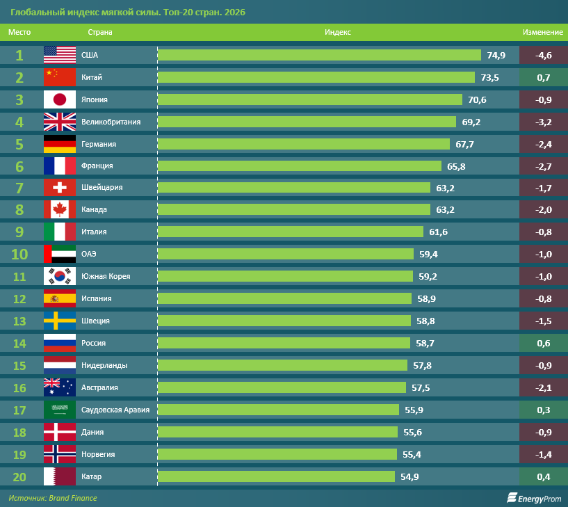 Таким образом, рейтинг 2026 года демонстрирует важную тенденцию: глобальная конкуренция смещается в сферу влияния, репутации и доверия, а баланс мягкой силы постепенно меняется в сторону более многополярного мира.