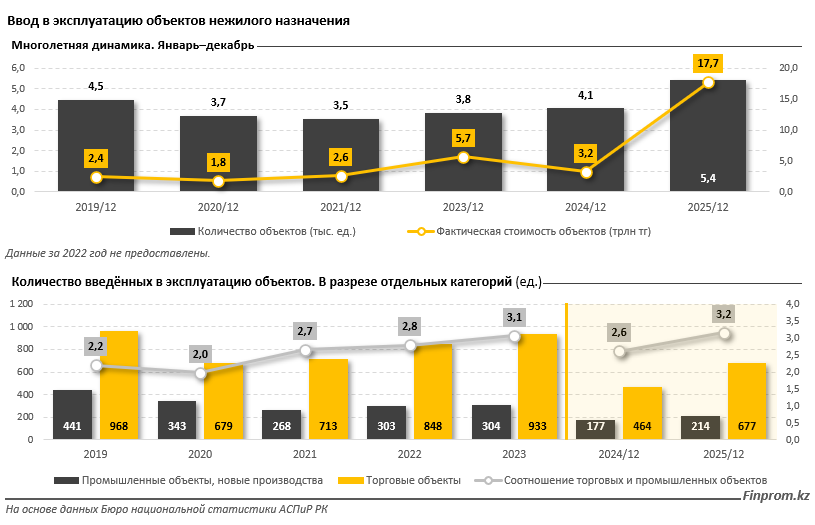 Прошлый год стал рекордным по объёму ввода нежилых объектов. Если в 2024 году их совокупная стоимость составляла 3,2 трлн тенге, то в 2025-м показатель достиг 17,7 трлн тенге - рост почти в шесть раз.
