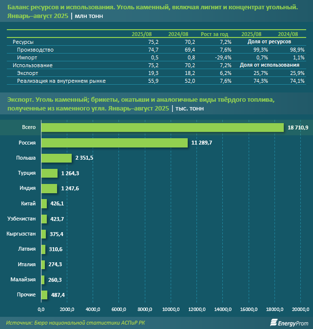 "За восемь месяцев текущего года из Казахстана было экспортировано 18,7 млн тонн каменного угля, брикетов, окатышей и аналогичных видов твёрдого топлива, полученных из каменного угля, на сумму в 381,4 млн долл. За год объём поставок вырос на 10,2%, а сумма — на 9,3%", - пишет Еnergyprom.kz.