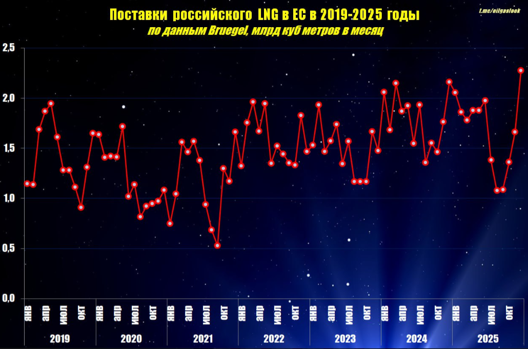 Декабрьский показатель в 2,3 млрд куб метров превзошел предыдущий месячный максимум более чем на 100 млн куб метров, что подчеркивает высокую интенсивность поставок в пиковый зимний период. Для европейского рынка это означает дополнительный источник энергоресурсов на фоне холодной погоды и роста потребления газа.