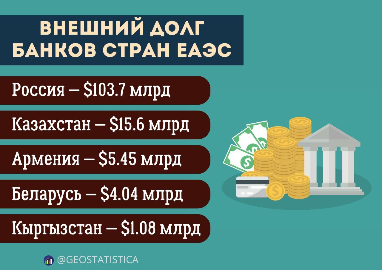 Согласно инфографике GeoStatistica, лидером по объему внешних заимствований традиционно остается Россия — 103,7 млрд долларов. На втором месте Казахстан с показателем 15,6 млрд долларов. Далее следуют Армения — 5,45 млрд долларов, Беларусь — 4,04 млрд долларов и Кыргызстан — 1,08 млрд долларов.