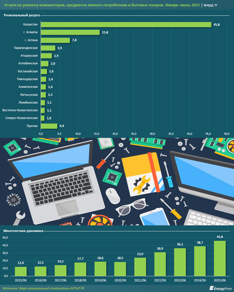 Рынок ремонта бытовой техники, компьютеров, обуви и мебели демонстрирует рекордный рост: за полгода объём услуг увеличился почти на 19% и достиг 45,8 млрд тенге, передает inbusiness.kz со ссылкой на energyprom.kz.