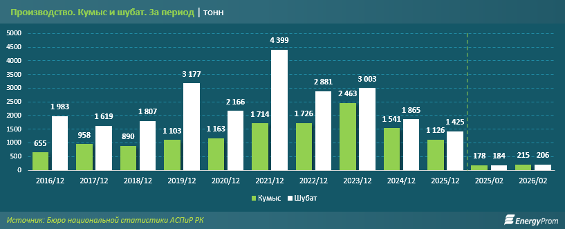 "Данные за январь–февраль 2026 года также указывают на сохраняющуюся нестабильность. Производство кумыса составило 215 тонн — на 20,8% больше, чем за аналогичный период 2025 года (178 тонн), но всё ещё значительно ниже уровня января–февраля 2024 года (314 тонн)", - подсчитали эксперты.