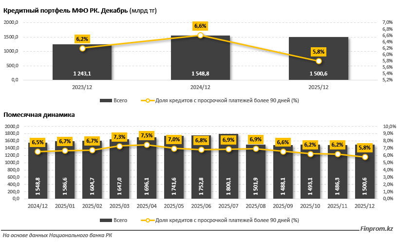 "Несмотря на уменьшение объёма портфеля, качество кредитов в секторе заметно улучшилось. Объём займов с просрочкой платежей более 90 дней за год сократился с 101,1 млрд до 87,1 млрд тг, то есть на 13,9% (с августа 2025-го — на 16,4%). Соответственно уменьшилась и доля проблемных кредитов: с 6,5% до 5,8%. В течение года их удельный вес также менялся. Весной наблюдалось ухудшение качества портфеля: в апреле доля NPL90+ достигала 7,5%. Однако во второй половине года показатель постепенно сокращался и к декабрю опустился ниже отметки в 6%", - пишет Finprom.kz.