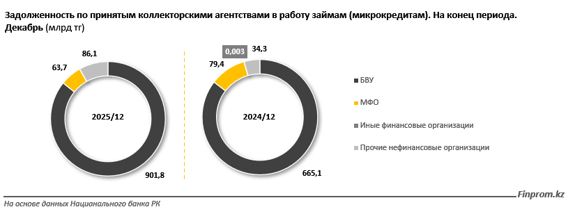 Объём займов, принятых коллекторами от БВУ по агентской схеме, вырос за год на 35,6% - с 665,1 млрд тенге в 2024 году до 901,8 млрд тенге в 2025-м. В то же время микрофинансовые организации сократили передачу долгов на 19,7%: с 79,4 млрд до 63,7 млрд тенге.