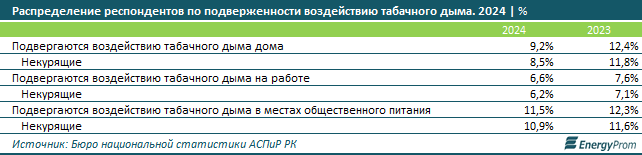 В 2024 году, согласно опросу Бюро национальной статистики АСПиР РК, 9,2% граждан Казахстана подвергались воздействию табачного дыма дома, из них 8,5% были некурящими, сообщает inbusiness.kz со ссылкой на Еnergyprom.kz.