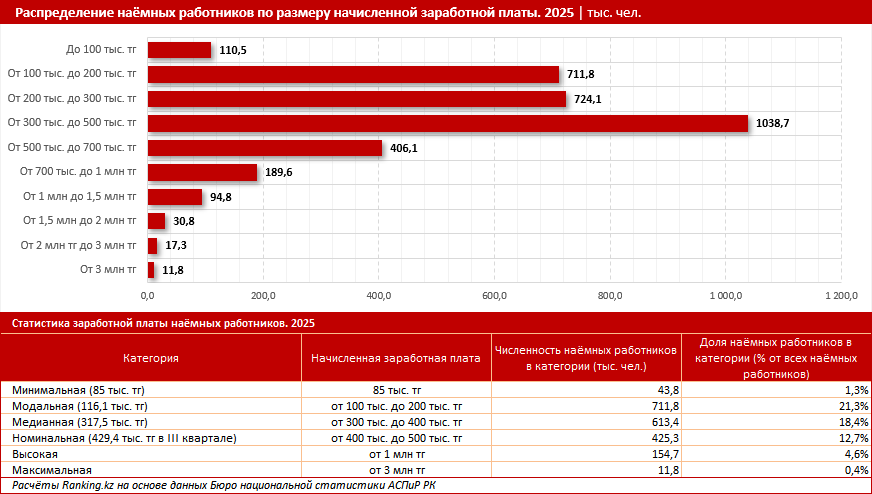 Шкала распределения сотрудников по уровню заработной платы показывает, что наибольшую группу — более 1 млн человек — составляли граждане с зарплатой от 300 тыс. до 500 тыс. тг. Второе место по численности занимали казахстанцы, зарабатывающие от 200 тыс. до 300 тыс. тг: 724,1 тыс. человек. Почти столько же насчитывалось работников с зарплатой от 100 тыс. до 200 тыс. тг: 711,8 тыс. человек. Эти три категории формировали основную массу трудящихся, чьи заработные платы укладываются в "средний класс".