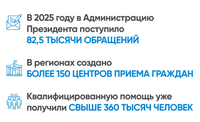 "Важно отметить, что диалог с гражданами осуществляется не только в цифровом формате. В регионах страны создано более 150 центров приёма граждан, где квалифицированную помощь уже получили свыше 360 тысяч человек. Эти центры обеспечивают личное общение с гражданами, консультации по вопросам государственных услуг и поддержку в решении социально значимых проблем", - подчеркнули пресс-секретарь главы государства.