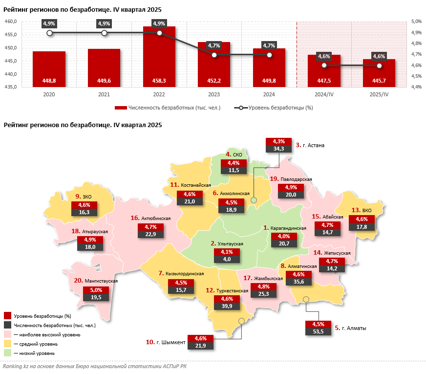Антилидером по уровню безработицы в октябре–декабре 2025-го стала Мангистауская область с показателем в 5%. Высоким уровнем также отличились Атырауская и Павлодарская области с одинаковыми значениями в 4,9%. Выше среднего также был уровень безработицы в Жамбылской, Актюбинской, Абайской и Жетысуской областях, варьирующийся от 4,7% до 4,8%.