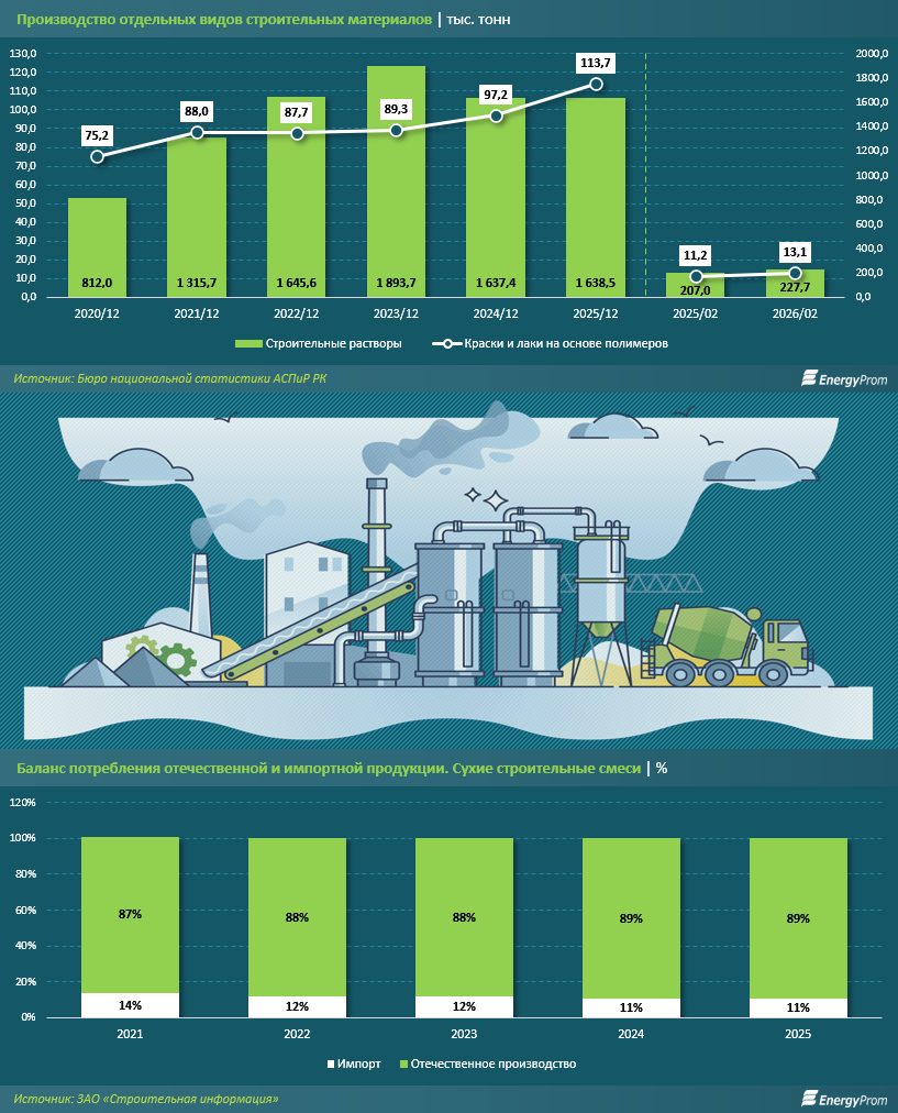 Согласно данным Бюро национальной статистики (БНС) АСПиР РК, по итогам января-февраля текущего года объём производства строительных растворов в стране вырос на 10%, достигнув 227,7 тыс. тонн, передает inbusiness.kz со ссылкой на Еnergyprom.kz.