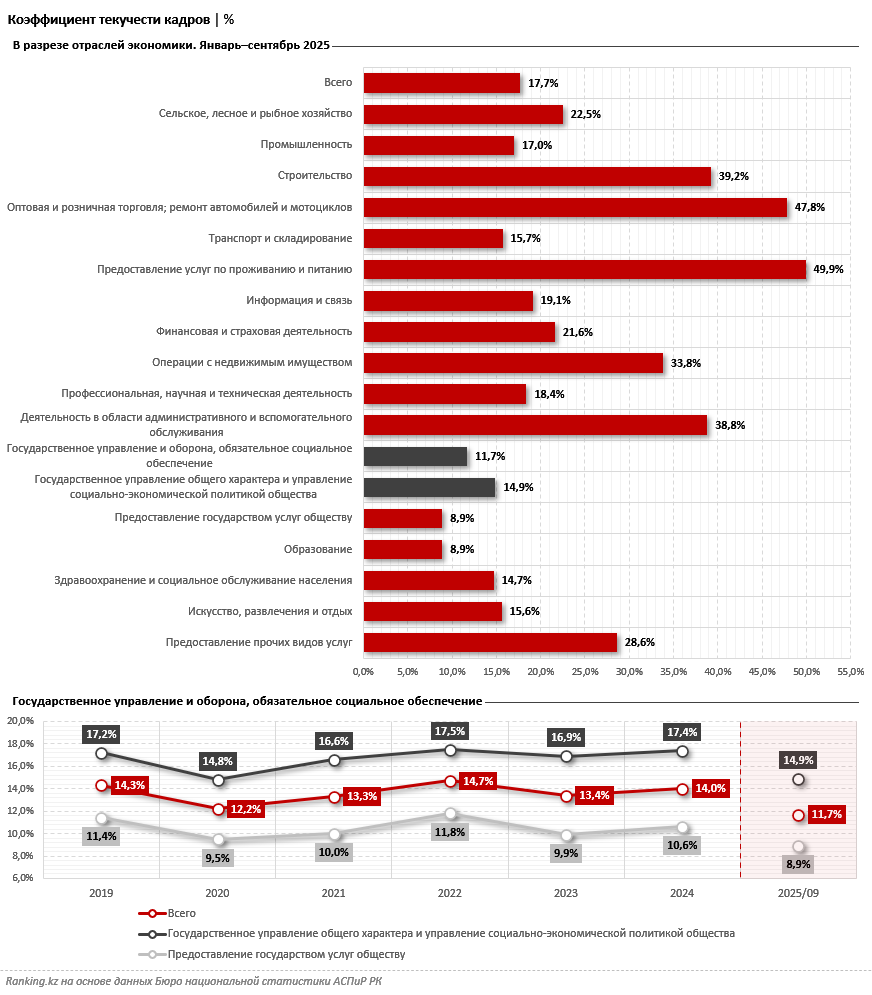 Версию текучести кадров в госслужбе также позволяют проверить данные, которые регулярно собирают статистики. Учитывая количество выбывающих специалистов, эксперты БНС рассчитывают коэффициент текучести. Отчёты за январь–сентябрь прошлого года подтверждают: "текучка" в сфере государственного управления и обороны, а также обязательного социального обеспечения есть, но она минимальна в сравнении с остальными отраслями экономики, передает inbusiness.kz со ссылкой на Ranking.kz.
