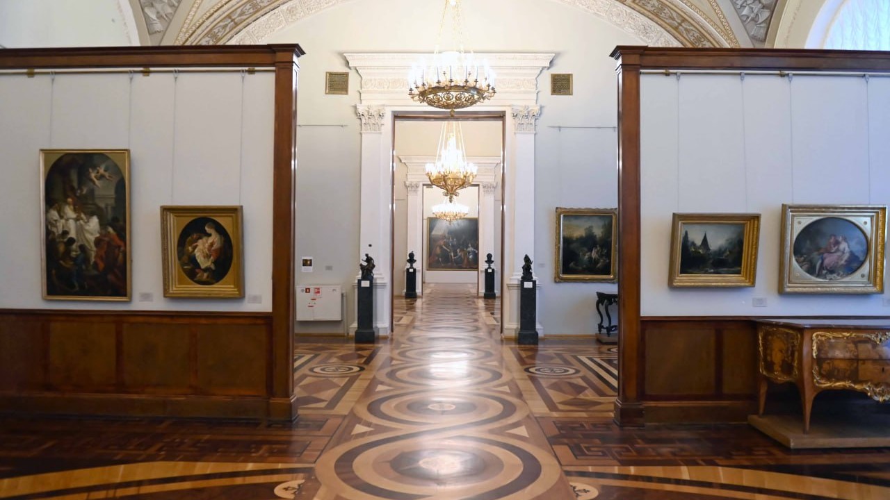 Главы государств осмотрели знаковые экспозиции, размещенные в Александровском зале и Зале искусства Франции XVIII века.