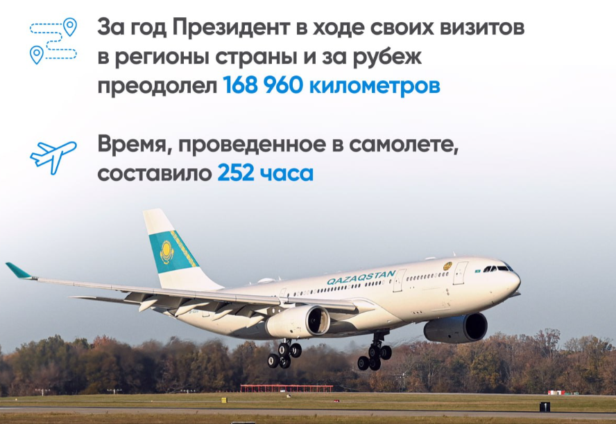 За год президент преодолел в ходе визитов и поездок внутри страны 168 960 километров, проведя в самолёте 252 часа. Эти показатели отражают интенсивность дипломатической деятельности и готовность Казахстана активно взаимодействовать с партнёрами по всему миру.