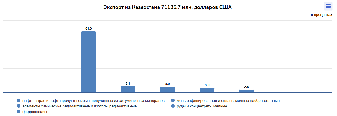 Структура экспорта Казахстана по-прежнему остаётся ориентированной на сырьевые товары. Основной удельный вес по экспорту за январь–декабрь 2025 года приходится на нефть сырую и нефтепродукты сырые, полученные из битуминозных минералов — 50,5%. Далее следуют элементы химические радиоактивные и изотопы радиоактивные — 5,3%, медь рафинированная и сплавы медные необработанные — 5,2%, руды и концентраты медные — 3,6%, ферросплавы — 2,6%.