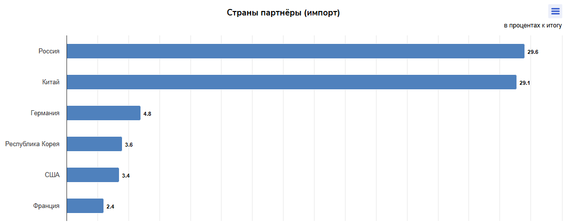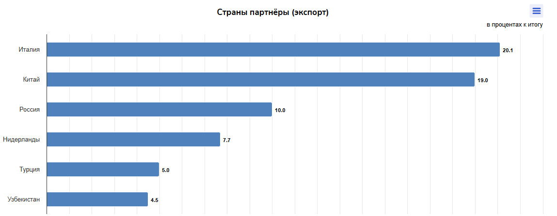 В структуре внешнеторгового оборота со странами ЕАЭС доминирует Российская Федерация — 88,6%. Далее следуют Кыргызская Республика — 7,3%, Республика Беларусь — 3,9% и Республика Армения — 0,2%.