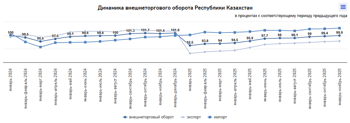 "Отдельного внимания заслуживает динамика взаимной торговли со странами Евразийского экономического союза. В январе–декабре 2025 года товарооборот Республики Казахстан со странами ЕАЭС составил 30893,1 млн долларов, что в номинальном выражении меньше на 0,1%, по сравнению с аналогичным периодом прошлого года", - привели данные в органах госстатистики.