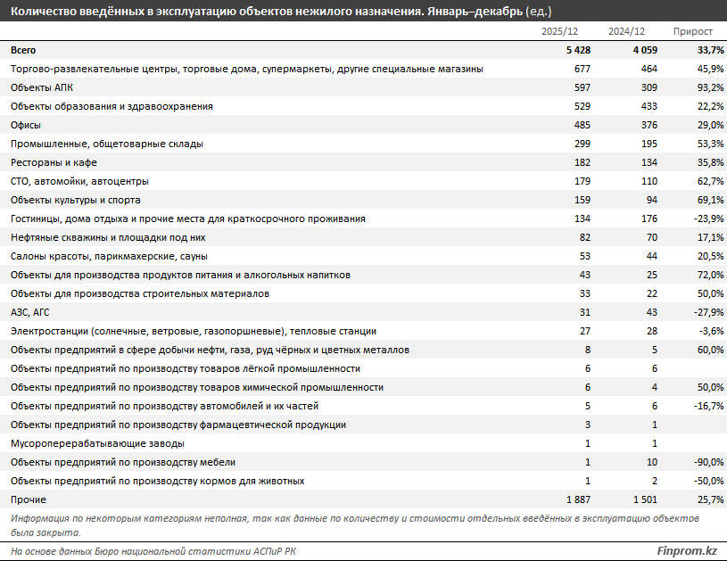 Структура ввода нежилых объектов в Казахстане за прошлый год наглядно показывает, какие направления стали приоритетными для бизнеса и государства. Лидерами по числу завершённых строек оказались торговые объекты, агропромышленный комплекс и социальная инфраструктура, следует из детализированных данных бюро национальной статистики АСПиР РК, передает inbusiness.kz со ссылкой на finprom.kz.