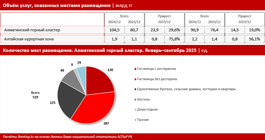 За период с января по сентябрь 2025 года гостиницы, хостелы и другие объекты размещения данного кластера оказали услуг на сумму 90,9 млрд тенге, что на 19% превышает показатели аналогичного периода прошлого года. Для сравнения, по итогам 2024 года объём услуг в Алматинском горном кластере достиг 104,5 млрд тенге, показав рост на 29,6% по сравнению с предыдущим годом.