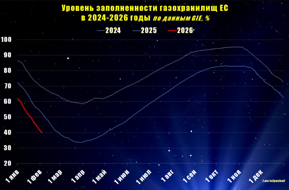 В Европейском союзе зафиксировано заметное сокращение запасов газа: уровень заполненности подземных газохранилищ опустился ниже 40 процентов. Это значение существенно уступает показателям предыдущих лет и усиливает обеспокоенность на энергетическом рынке региона на фоне продолжающегося отопительного сезона и нестабильной ситуации с поставками топлива, передает inbusiness.kz со ссылкой на телеграм-канал OilGazLook.