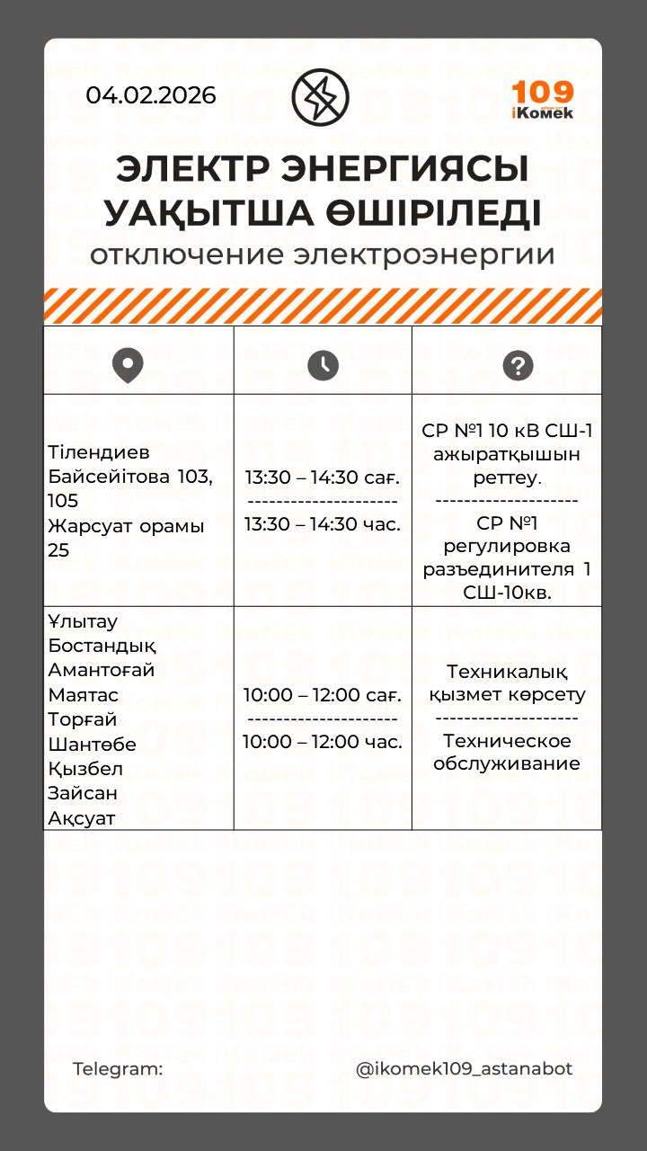 4 февраля без электричества останутся некоторые районы столицы, передает inbusiness.kz.