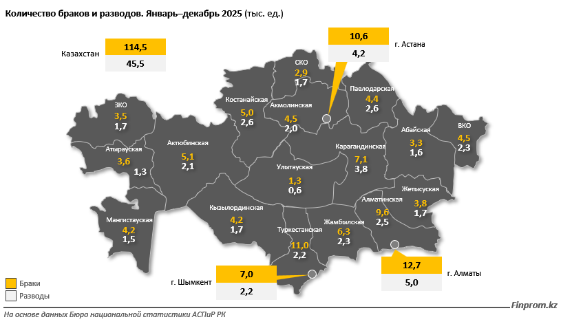 В региональном разрезе наибольшее количество браков за 2025 год было зафиксировано в Алматы (12,7 тыс.), Туркестанской области (11 тыс.) и Астане (10,6 тыс.), передает inbusiness.kz со ссылкой на Finprom.kz.