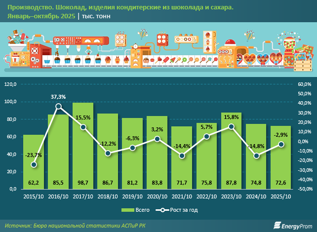 Производство шоколада и кондитерских изделий в Казахстане продолжает снижаться: за январь–октябрь 2025 года выпуск упал на 2,9%, а годом ранее - почти на 15%, передает inbusiness.kz со ссылкой на energyprom.kz.