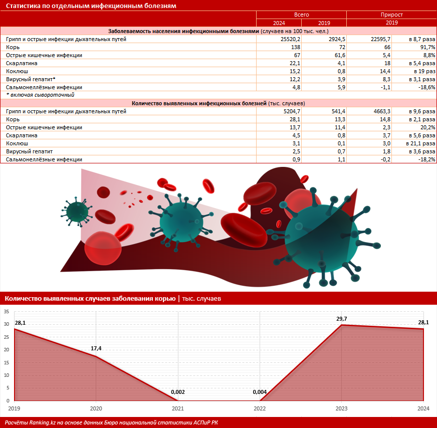 В Казахстане существенно выросла заболеваемость рядом инфекционных заболеваний. Сравнение показателей за 2024 год с 2019-м показывает: многие инфекции распространяются быстрее, чем ранее, а большая часть случаев могла быть предотвращена.