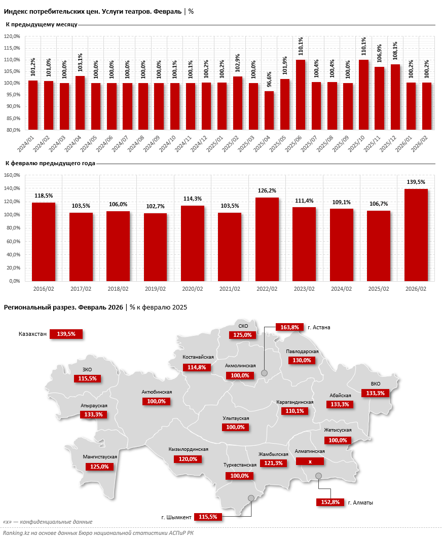 При этом в годовом выражении подорожание оказалось крайне значительным. По итогам февраля 2026 года цены на театральные услуги выросли на 39,5% по сравнению с аналогичным периодом прошлого года. Наиболее заметный рост зафиксирован в крупнейших городах страны: в Астане цены увеличились на 63,8%, а в Алматы - в полтора раза.