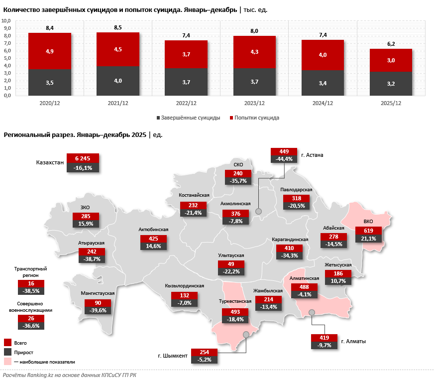 Согласно данным Комитета по правовой статистике и специальным учётам Генеральной прокуратуры РК, за январь-декабрь прошлого года добровольно ушли из жизни около 3,2 тыс. человек. Это на 5,7% меньше по сравнению с аналогичным периодом 2024 года, что в абсолютных цифрах составляет снижение на 193 случая. В целом с 2020 года количество суицидов в стране уменьшилось на 9,1%, достигнув минимального уровня за несколько лет наблюдений.