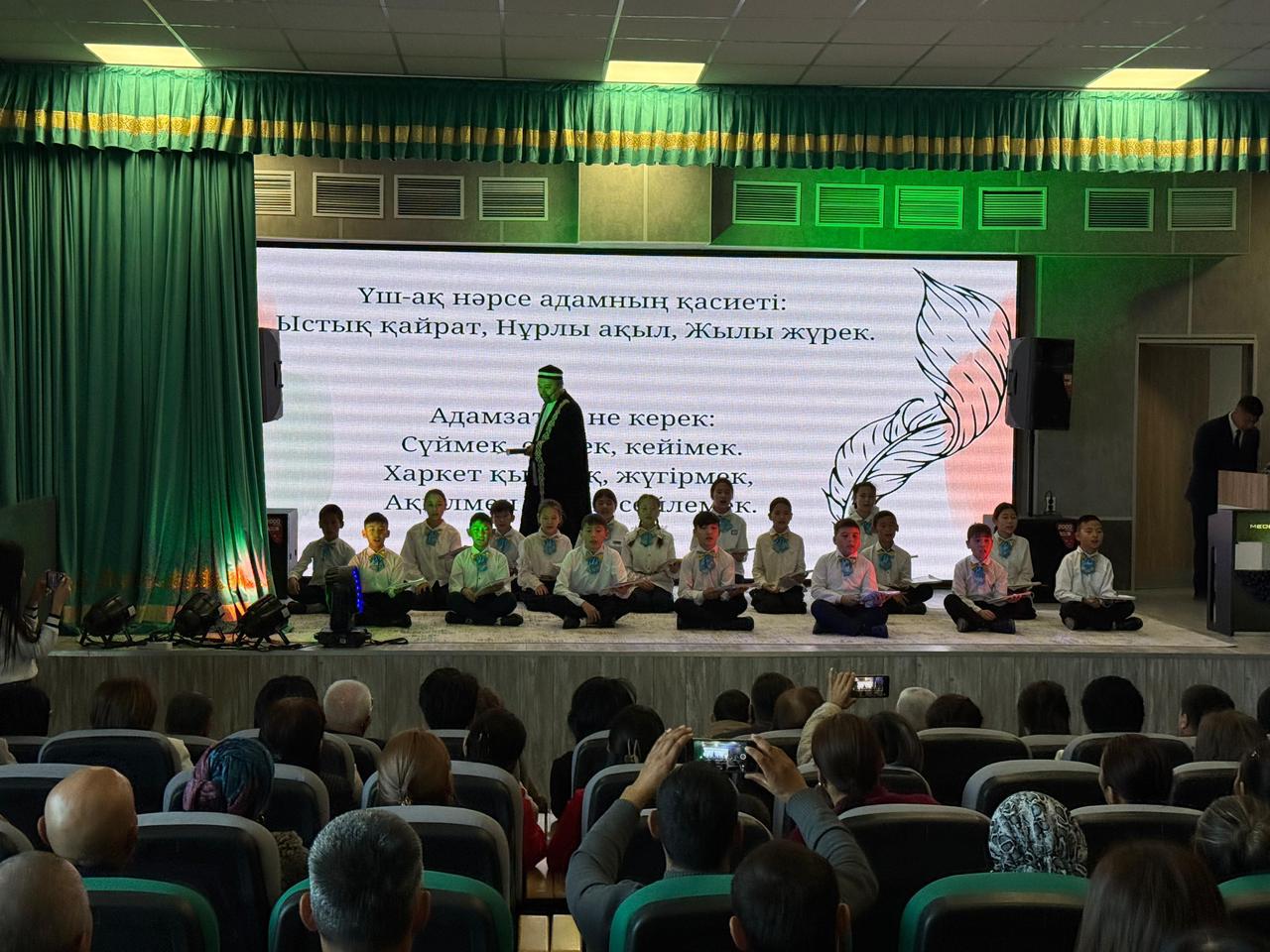 В завершение мероприятия ученики представили постановку, посвящённую 180-летию Абая, прочитали стихи и отрывки из его произведений, исполнили песни. В фойе школы была оформлена интерактивная зона "Стена будущего", где гости оставили свои пожелания.