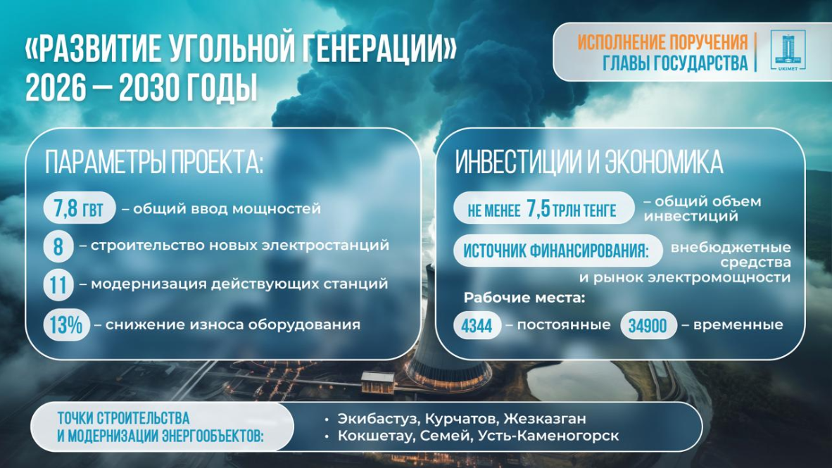 По данным пресс-службы премьера Казахстана, нацпроектом предусмотрен ввод и обновление 7,8 ГВт мощностей. Планируется строительство восьми новых энергоисточников, включая крупнейшие объекты в Экибастузе мощностью 2 640 МВт, Курчатове — 700 МВт и Жезказгане — 500 МВт. Также предусмотрено строительство современных теплоэлектроцентралей в Кокшетау, Семее и Усть-Каменогорске.