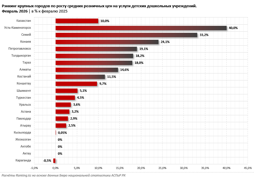 Наиболее заметное удорожание услуг дошкольных учреждений было зафиксировано в Усть-Каменогорске: сразу на 40%.