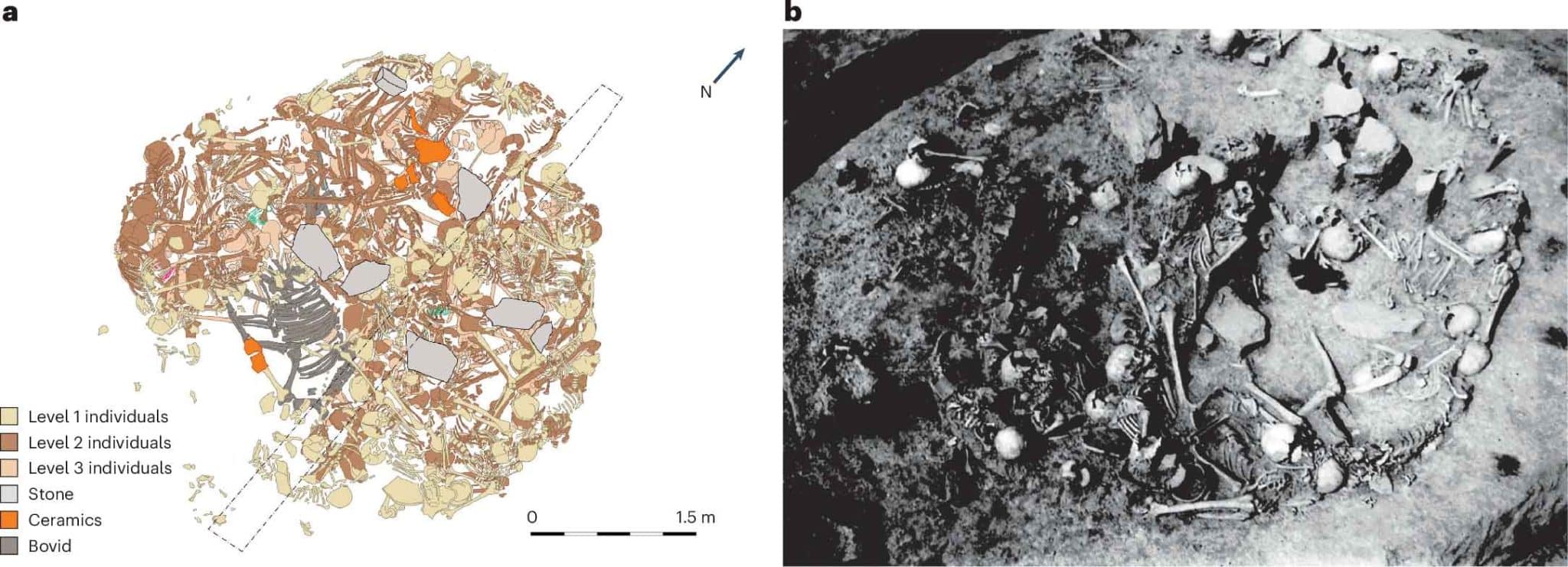 Фото: а) План захоронения человеческих останков и находок из Гомолаве; b) Фотография массового захоронения в Гомолаве / © Linda Fibiger, S.N. Tasic, Museum of Vojvodin