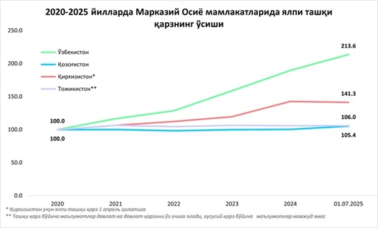 Узбекистан занимает лидирующие позиции в регионе по темпам роста совокупного внешнего долга: с 2020 года он увеличился в 2,1 раза. Для сравнения, внешний долг Кыргызстана за тот же период вырос на 41,3%, а в Казахстане и Таджикистане — на 5,4% и 6% соответственно.