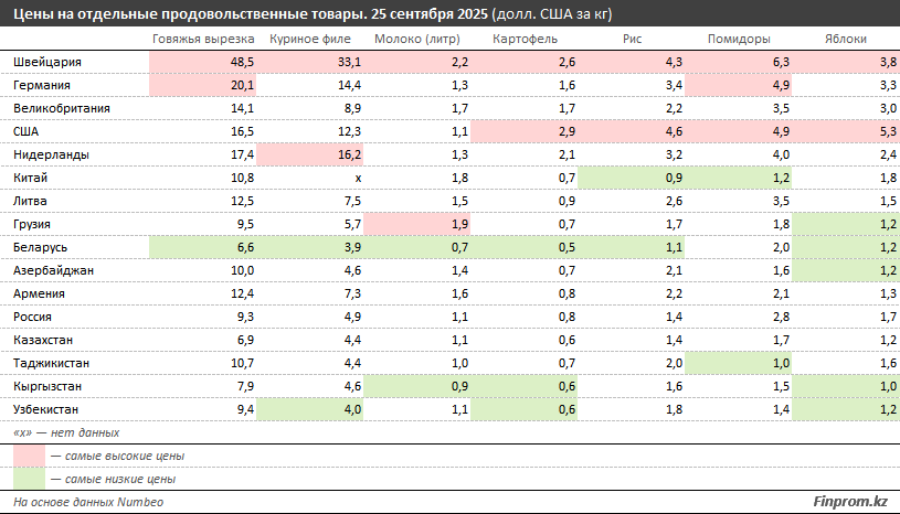 Сравнение ценников в странах с дорогими продуктами и государствах с более доступными ценами на продовольствие показывает их колоссальную разницу. Например, в Швейцарии стоимость килограмма говяжьей вырезки (48,5 долларов, или 26,3 тыс. тенге) в 7 раз больше, чем в Казахстане (6,9 долларов). Куриное филе в этой стране дороже, чем в РК, в 7,6 раза, картофель — в 4,5 раза, помидоры — в 3,6 раза, рис и яблоки — в 3,1 раза.