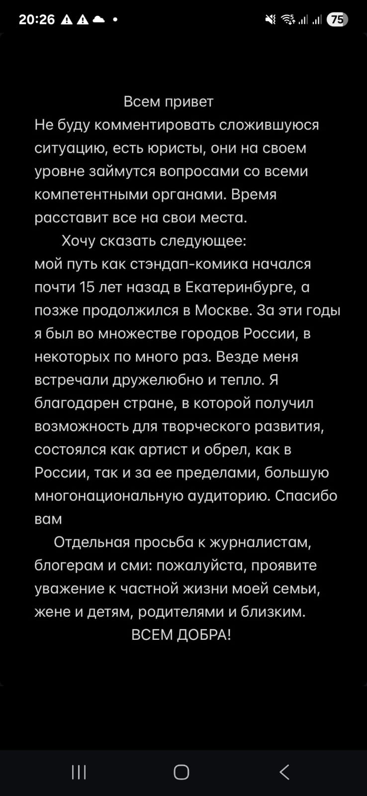 "Я благодарен стране, в которой получил возможность для творческого развития, состоялся как артист и обрел большую многонациональную аудиторию", — подчеркнул он в своем обращении.