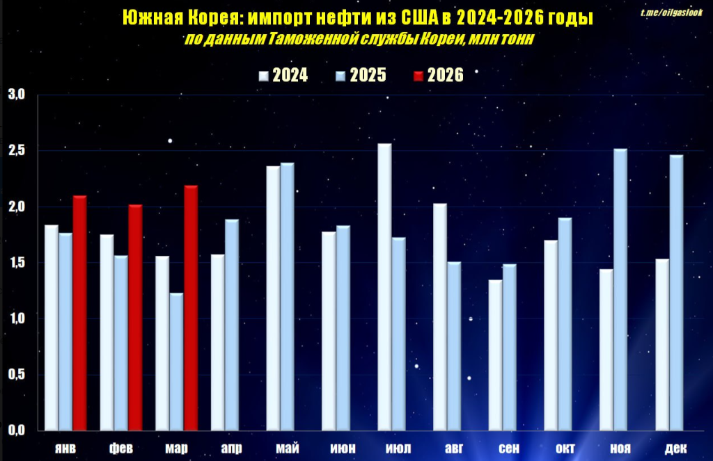 По итогам января–марта 2026 года, Южная Корея импортировала из США 6,3 млн тонн нефти, что на 38% больше, по сравнению с аналогичным периодом 2025 года.
